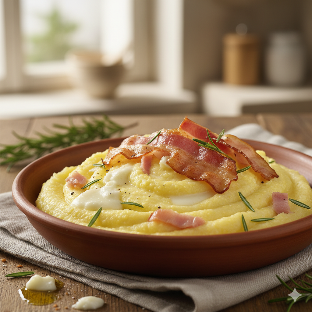 Polenta mantecata con stracchino, prosciutto cotto croccante e rosmarino